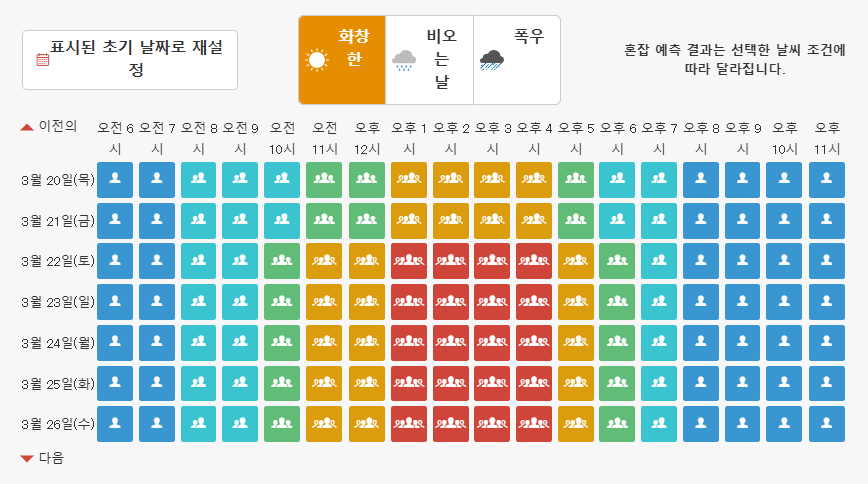 | - 화면의 좌측에서 위 아래로 조정하여 혼잡도를 보고 싶은 날짜를 설정할 수 있습니다. - 날씨 조건을 선택하면 날씨에 따른 혼잡도가 예측 됩니다. - 또한, 실시간 라이브 스트리밍을 선택해 현재 시점의 혼잡도를 눈으로 확인할 수도 있습니다. ![]() ![]() |