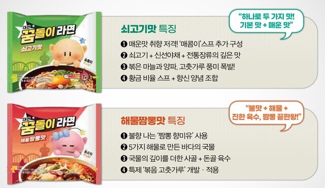 꿈돌이 라면은 총 2가지 맛으로 구성돼 있어요. 각기 다른 매력을 가진 두 가지 맛, 모두 먹어보고 싶어질 정도로 정성스럽게 만들어졌어요.