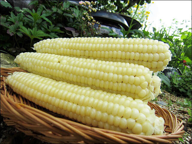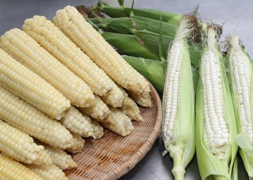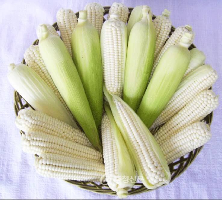 일반 옥수수보다 가늘고 길쭉하고 보다 백색에 가까운 색이에요.