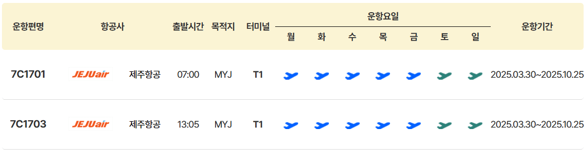 매주 수요일, 금요일, 일요일 오후 16시 30분에 출발합니다. 비행시간은 대략 1시간 10분입니다.