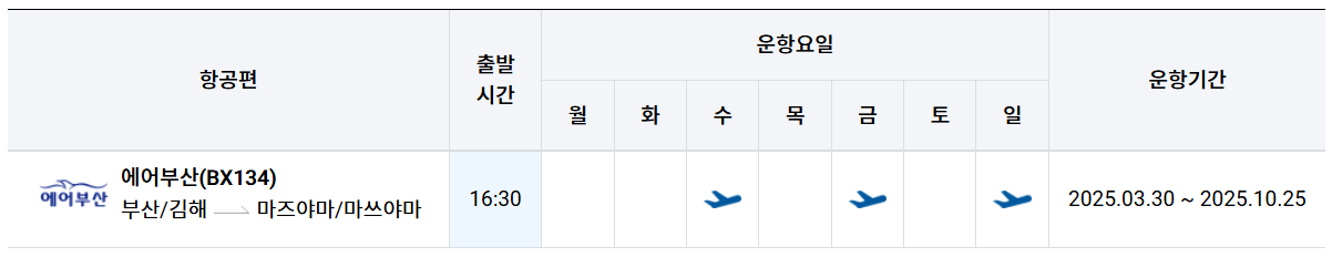 현재 김해국제공항(PUS)에서는 마쓰야마공항(MYJ)까지 에어부산이 직항 노선을 운영하고 있는데요.
