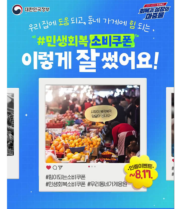 덤으로 우리 동네 가게도 응원하는 뿌듯함까지 느낄 수 있잖아요. 민생회복 소비쿠폰 사용 이벤트! 지금 바로 참여해보시기 바랍니다.