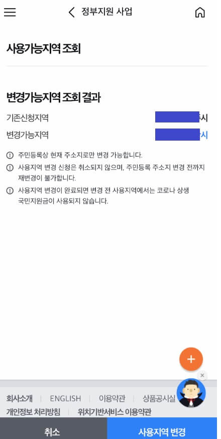 전입신고 등을 통해 주소지 변경이 완료되어야 사용지역 변경이 정식으로 인정되는데요. 카드사의 개인정보를 변경하는 것과 무관하니 반드시 관공서를 통해 주소지 변경을 먼저 완료하셔야 해요.