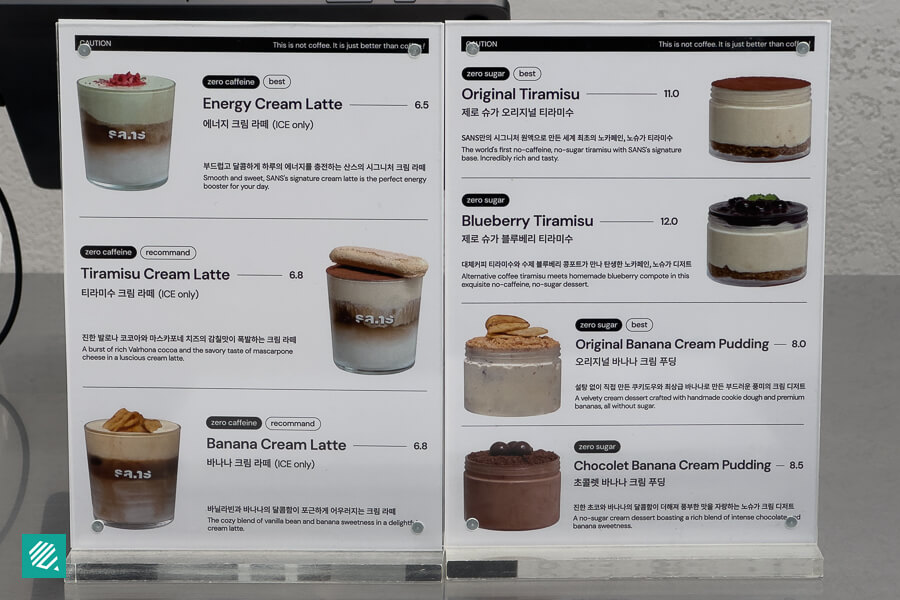 카페라떼, 아메리카노, 티라미수까지… 메뉴만 보면 그냥 일반 카페 같지만 커피 원두는 단 한 알도 쓰지 않는다는 점에서 완전히 다른 카페입니다.