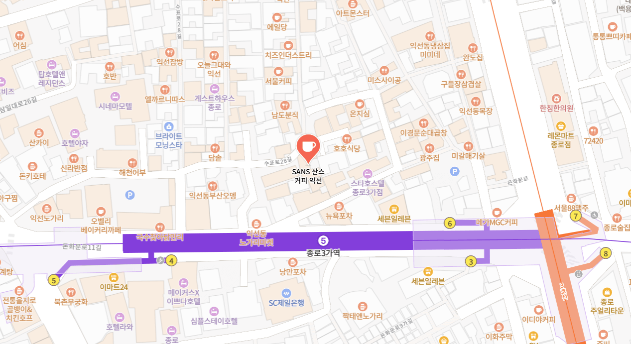 산스커피는 종로구 익선동에 1호 플래그쉽 스토어가 위치해 있습니다.