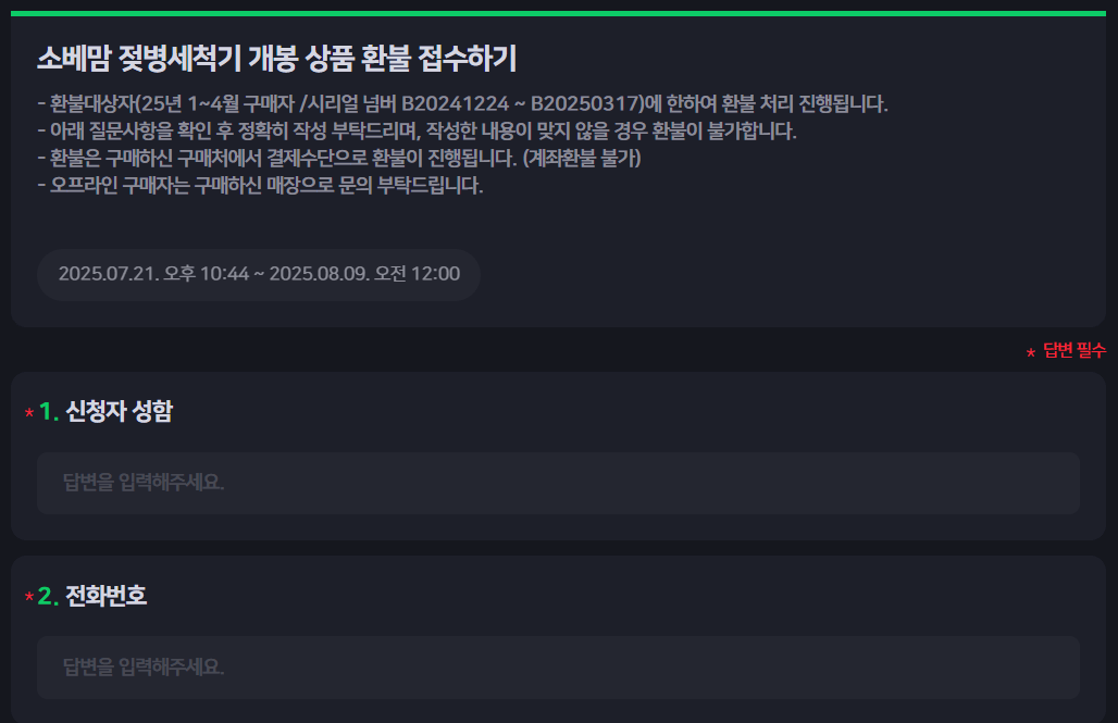 제품을 개봉했는지 유무에 따라 환불 신청 페이지가 달라요. 환불 대상이신 분들은 아래 링크를 통해 환불 신청하시면 됩니다.