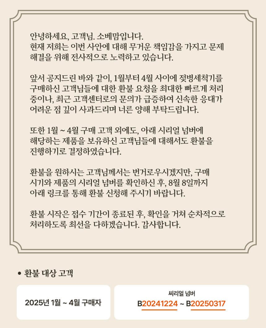 환불대상 시리얼번호 "B20241224 - B20250317"