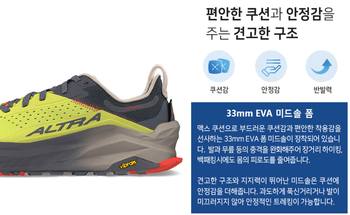 올림퍼스6는 알트라 특유의 '제로 드롭' 구조는 물론이고, 편안한 착화감과 발을 자연스럽게 감싸주는 발볼 넓은 디자인 덕분에 요즘 트레일 러닝 마니아들 사이에서 큰 인기를 끌고 있거든요.