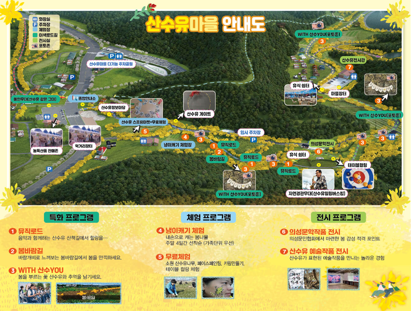 - 뮤직로드, 봄바람길, With 산수You: 마을 곳곳에 조성된 산수유 꽃길을 따라 걷는 프로그램으로, 노란 꽃물결 속에서 봄의 정취를 만끽할 수 있습니다.