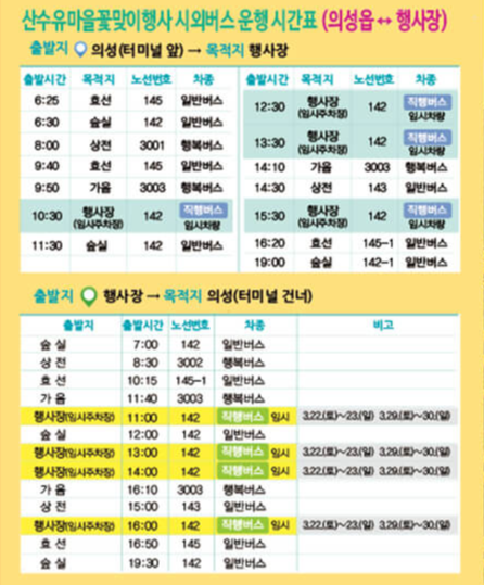 의성 터미널에서 산수유마을까지 시외버스를 이용할 수 있는데요. 운행시간표는 아래 내용을 참고해주세요.