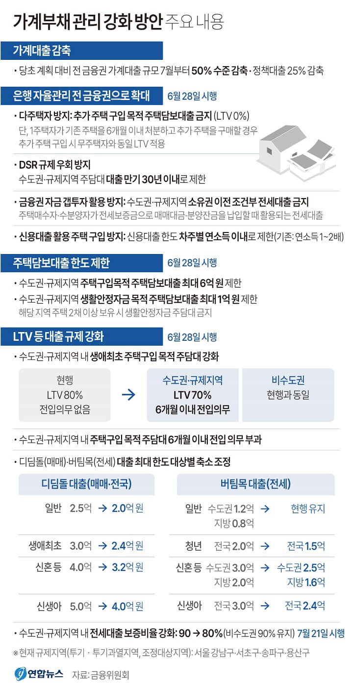 7월부터 전 금융권의 가계대출 총량이 기존 대비 50% 수준으로 대폭 축소되고 정책금융 상품도 25% 줄어든다고 하니 대출 받아서 집 사려는 분들에겐 꽤 큰 제약이 되겠지요.