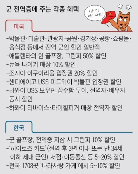 오히려 미국 등 해외에서는 다양한 혜택을 받을 수 있다고 해요. 미국의 박물관, 미술관, 관광지, 공원, 경기장, 공항, 쇼핑몰, 음식점 등에서는 군 전역자를 대상으로 한 할인이 일반적이라고 하는데요.