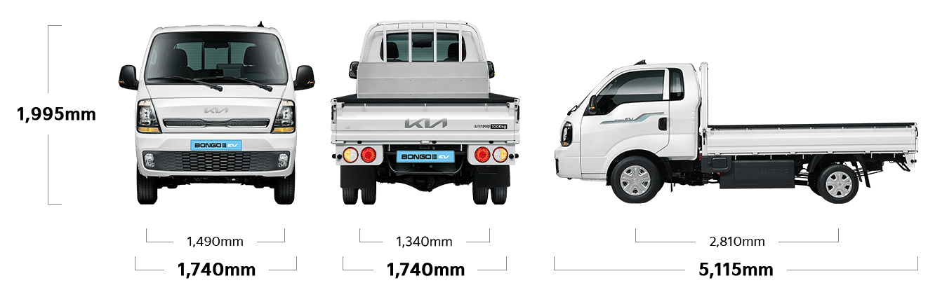 전장은 5,115mm, 전폭은 1,740mm, 전고 1,995mm로 내연기관 봉고3 모델과 동일하지만, 휠베이스는 2,810mm로 약 200mm 길어져 주행 안정성이 뛰어 납니다.