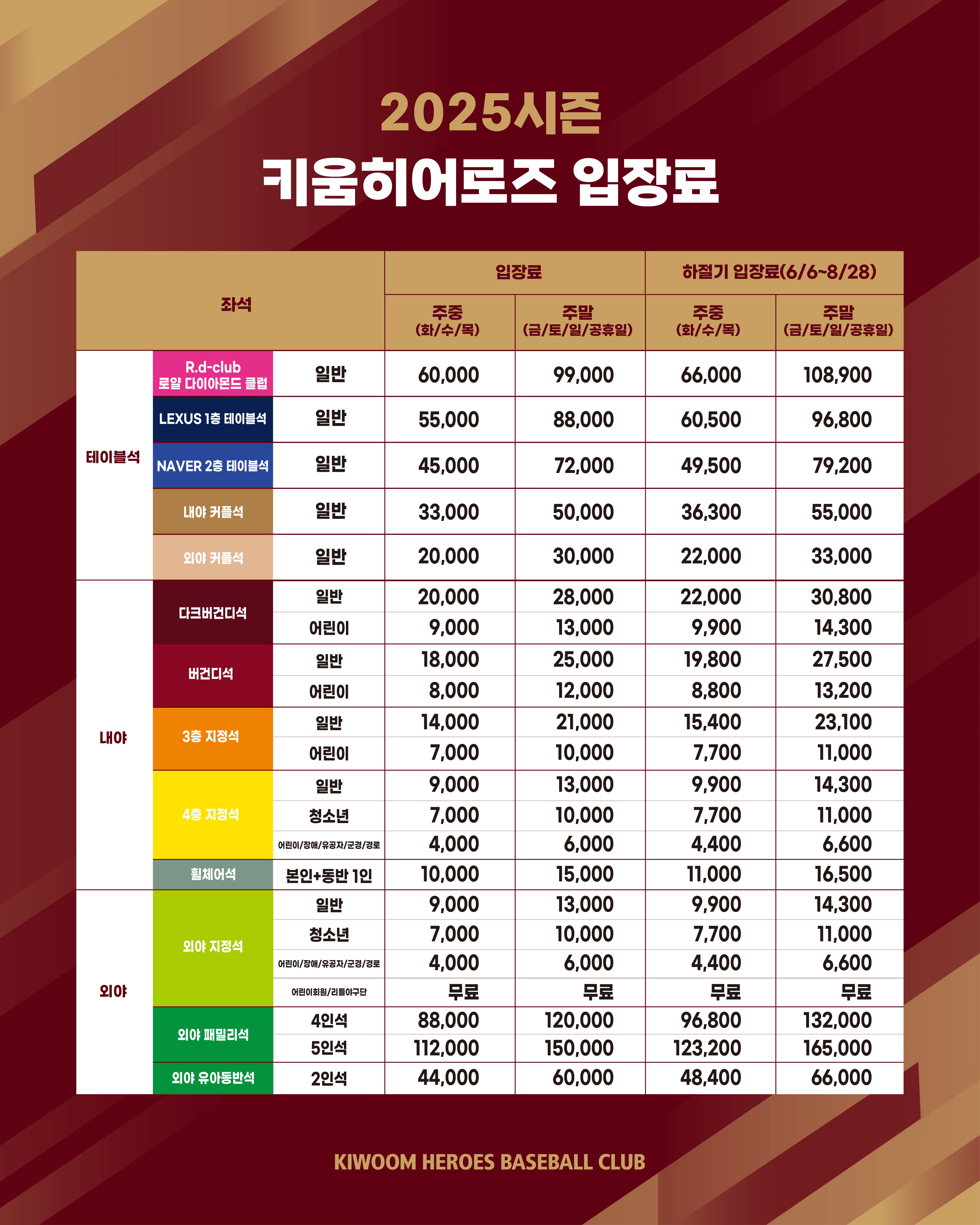 키움 히어로즈는 2025시즌 동안 홈경기 입장료에 계절별 요금제를 도입하기로 결정했습니다.