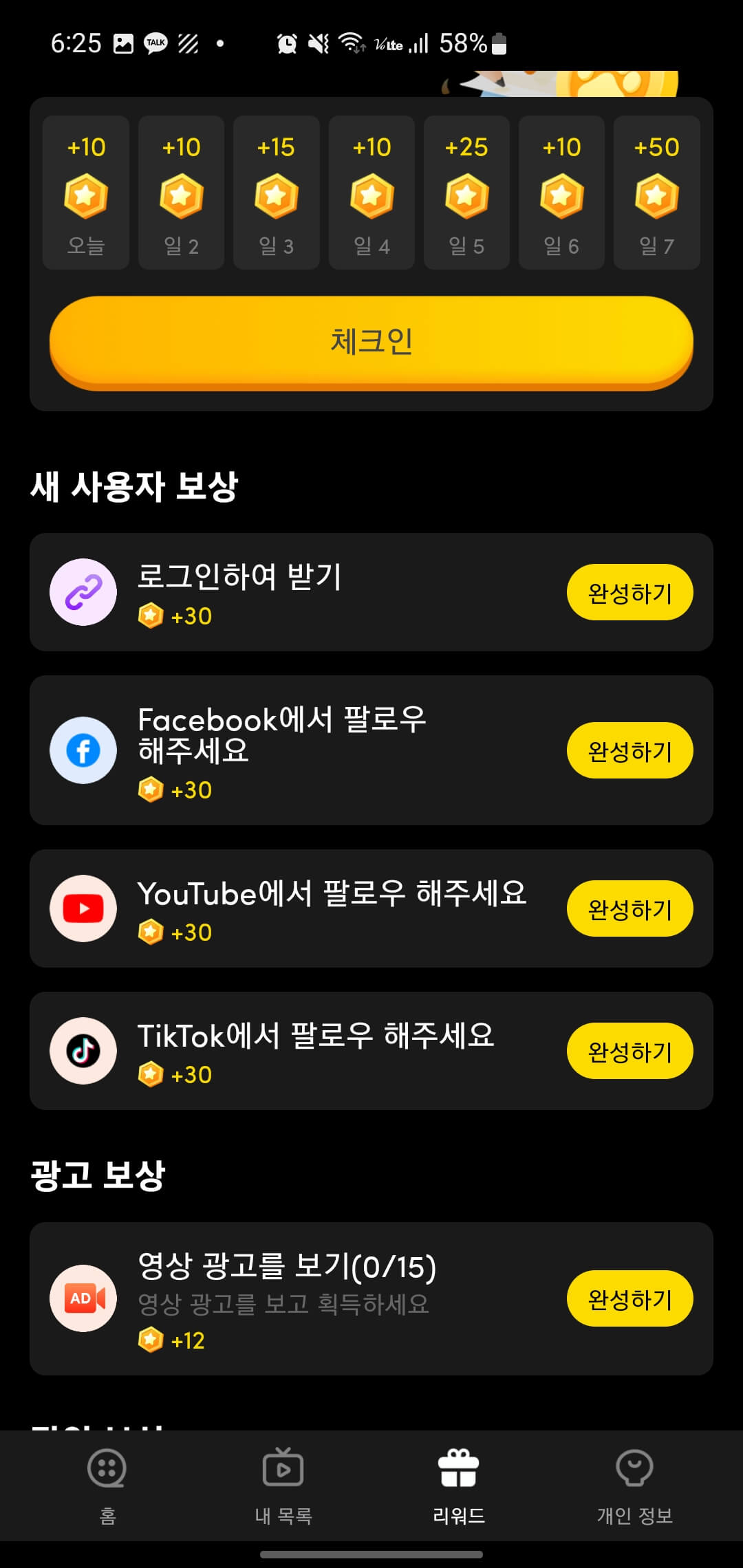 코인은 앱 내에서 간단히 구매 가능하고 결제 방식도 편리합니다. 하지만, 매일 앱에 접속하거나 앱 내에서 광고를 시청하면 무료로 코인을 얻어 유료 콘텐츠를 무료로 볼 수 있는 팁이 있어요. 꾸준히 이용한다면 비용의 부담 없이 유료 콘텐츠까지 즐길 수 있다는 점!