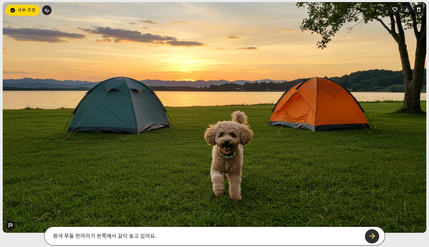 5. (선택 사항) 세부 조정: 원하는 이미지를 선택한 후 좌측 상단 '세부 조정'을 기능을 이용하여 일부분에 대한 수정을 진행할 수 있습니다. 세부 조정은 한글입력이 가능합니다. 보다 디테일한 수정을 위해서는 '세부 조정' 옆 '프롬프트' 버튼을 눌러 수정할 수 있으나 프롬프트는 영어로만 수정이 가능해요. 아래 예시에서는 '흰색 푸들 한마리를 추가' 하는 세부 조정 사항을 입력하였습니다.