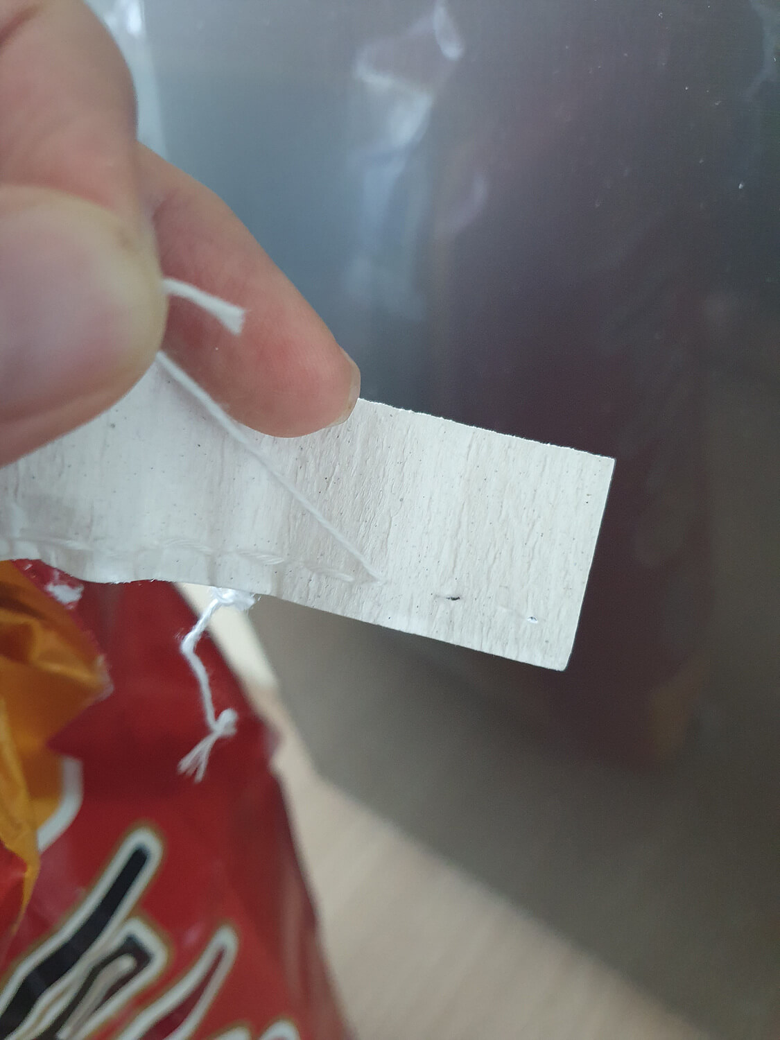 쌀포대 입구를 막고 있는 종이띠를 살펴보면, 아래 사진과 같이 '실 한줄로 매듭이 이어져 있는 면'과 '두 개의 실이 꼬여져 있는 면' 이 있어요.