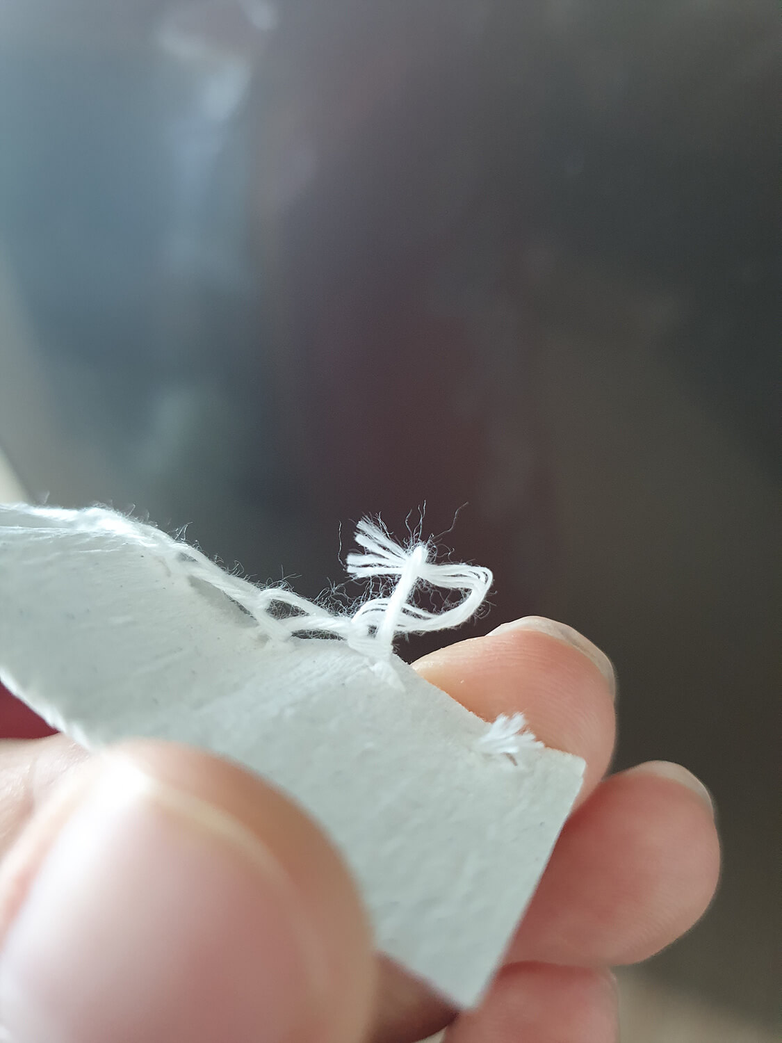 매듭의 오른쪽 끝(핵심POINT!)을 보면 끝부분에 실밥 하나가 살짝 튀어나와 있어요. 손으로 잡아서 당겨보세요. 약 1cm 정도의 실밥 하나가 떨어져 나옵니다.