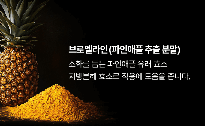 파인애플 효소 분말인데요. 브로멜라인은 단백질 기수 분해 효소로서 소화를 돕고 대사 증진 효과가 있는 것으로 알려져 있어요.
