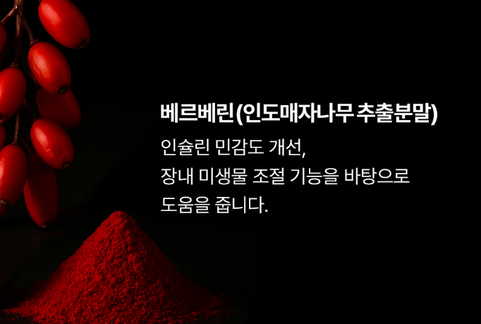 세포 청소부라고 불리는 베르베린은 자가포식을 촉진하는 성분으로 내 몸의 세포를 정돈하는데 탁월합니다. 뿐만 아니라 항산화, 콜레스테롤, 혈당 등을 조절하는데 도움을 주는 성분입니다,