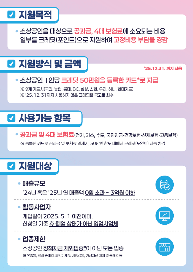1인당 50만 원을 디지털 포인트(크레딧)로 지급받아 공과금‧4대 보험료 같은 고정비에 바로 쓸 수 있는 ‘소상공인 부담경감 크레딧’을 상세히 풀어볼게요.