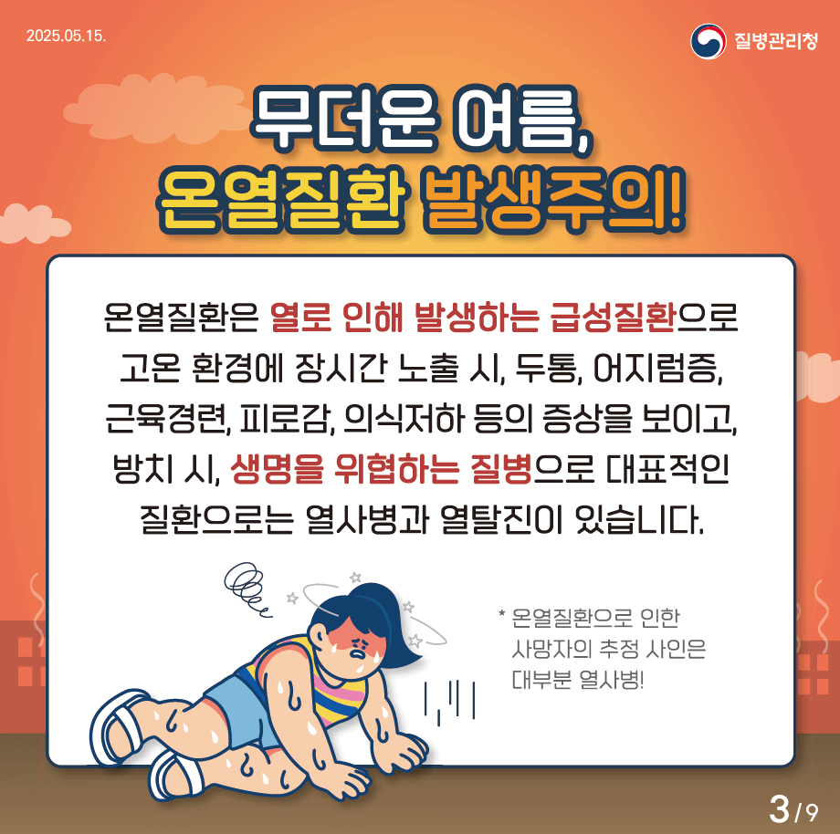 - 충분한 수분·전해질 유지가 핵심. 폭염 노출 자제, 증상 악화 시 바로 진료.