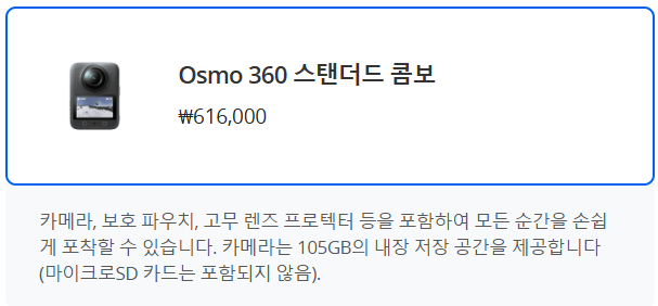 DJI 오즈모360은 616,000원으로, 인스타360 X5보다 조금 더 저렴하게 출시되었어요. 가성비 측면에서 아주 훌륭하죠!